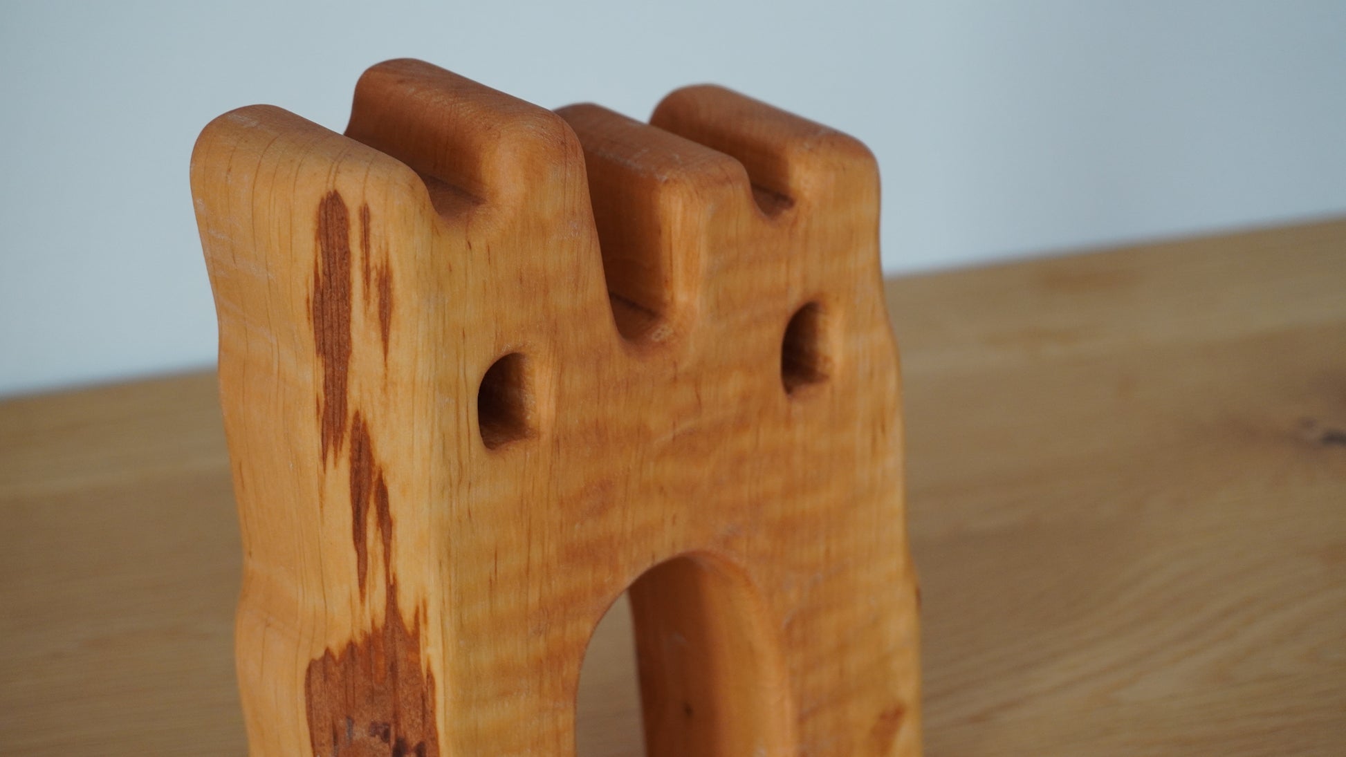 Gefertigt aus regionalem Erlenholz, wird jedes Teil individuell geschnitzt, zugesägt und sorgfältig geschliffen. Alle Kanten sind sanft abgerundet. Einige Elemente behalten ihre natürliche Baumborke, die fest mit dem Holz verbunden ist. Diese Mischung aus glatten und gebürsteten Oberflächen fördert nachhaltig den Tastsinn.