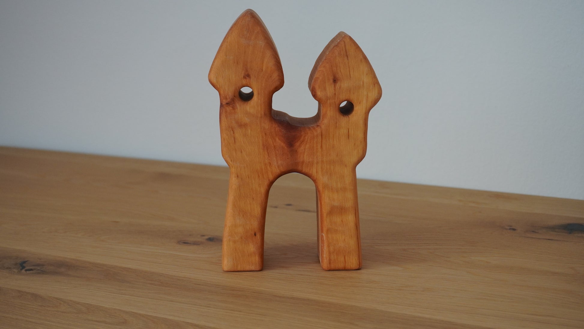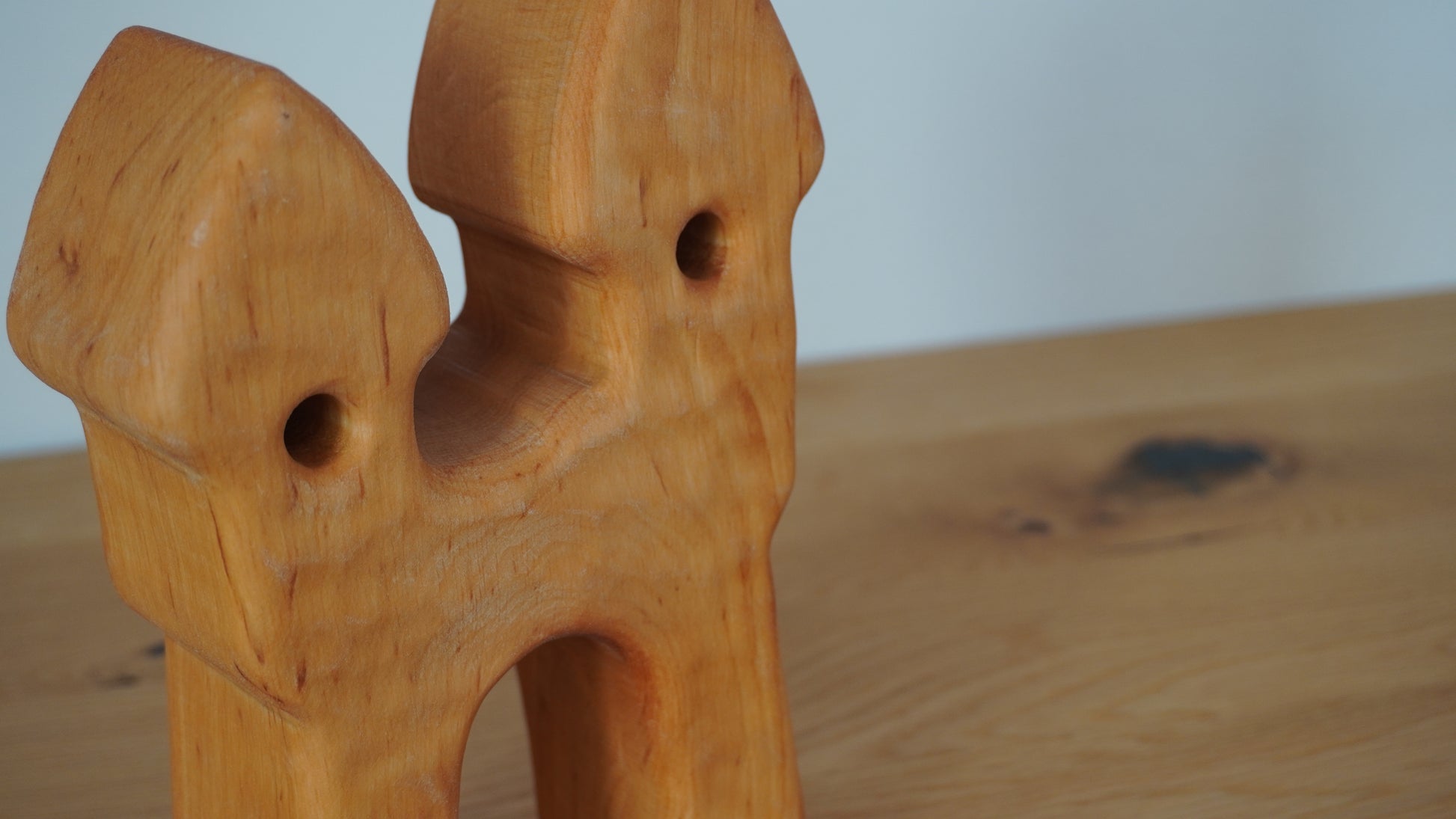 Gefertigt aus regionalem Erlenholz, wird jedes Teil individuell geschnitzt, zugesägt und sorgfältig geschliffen. Alle Kanten sind sanft abgerundet. Einige Elemente behalten ihre natürliche Baumborke, die fest mit dem Holz verbunden ist. Diese Kombination aus glatten und gebürsteten Oberflächen fördert nachhaltig den Tastsinn.