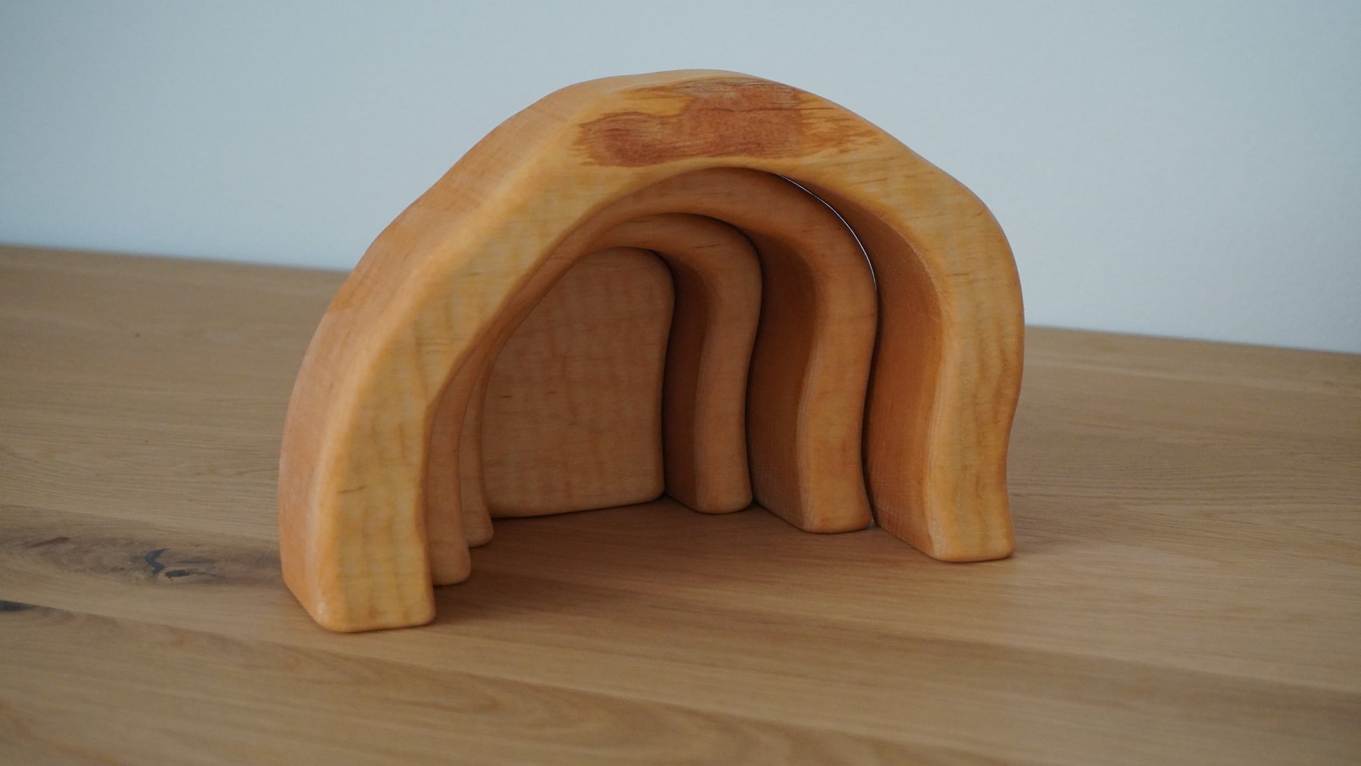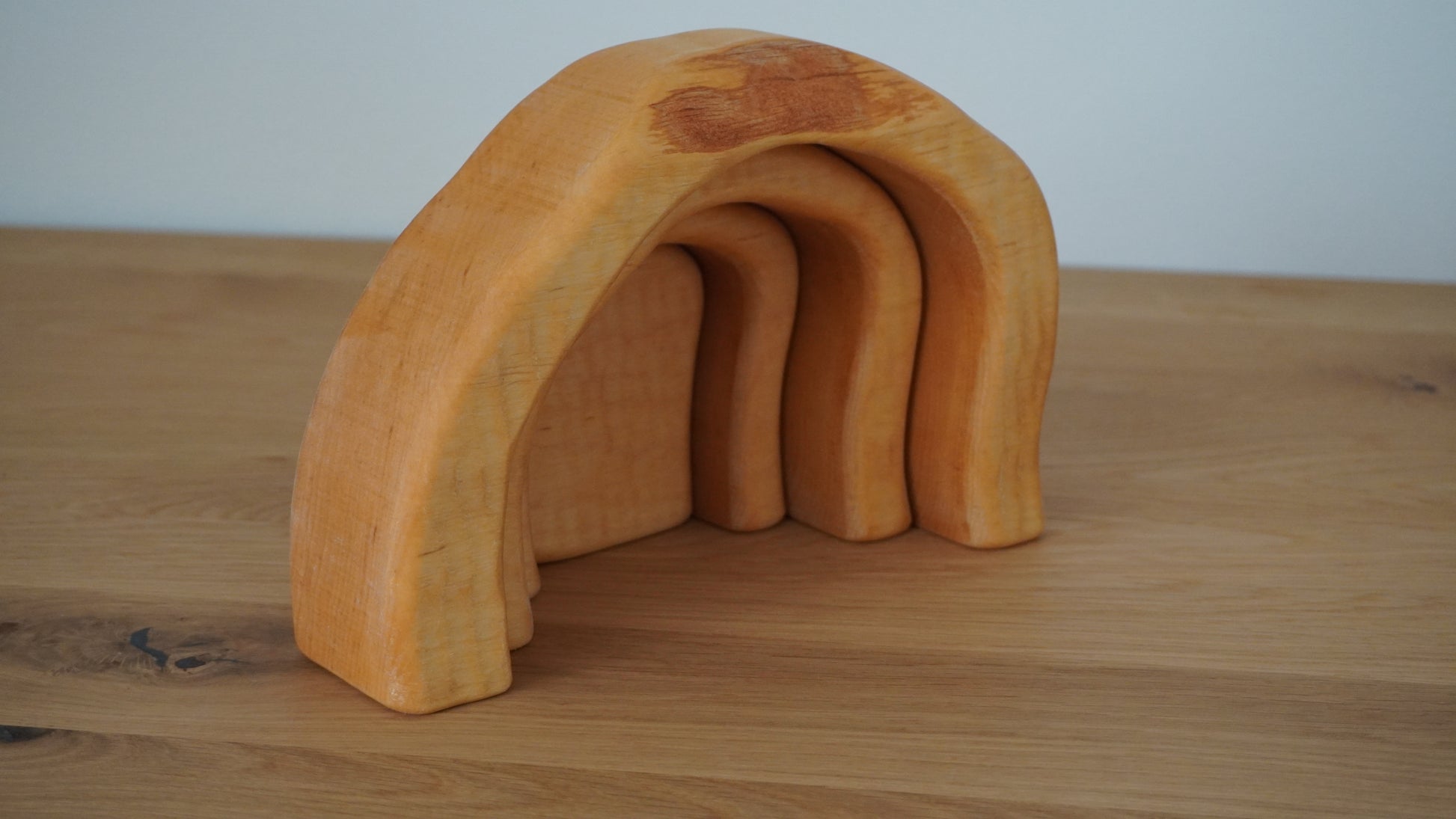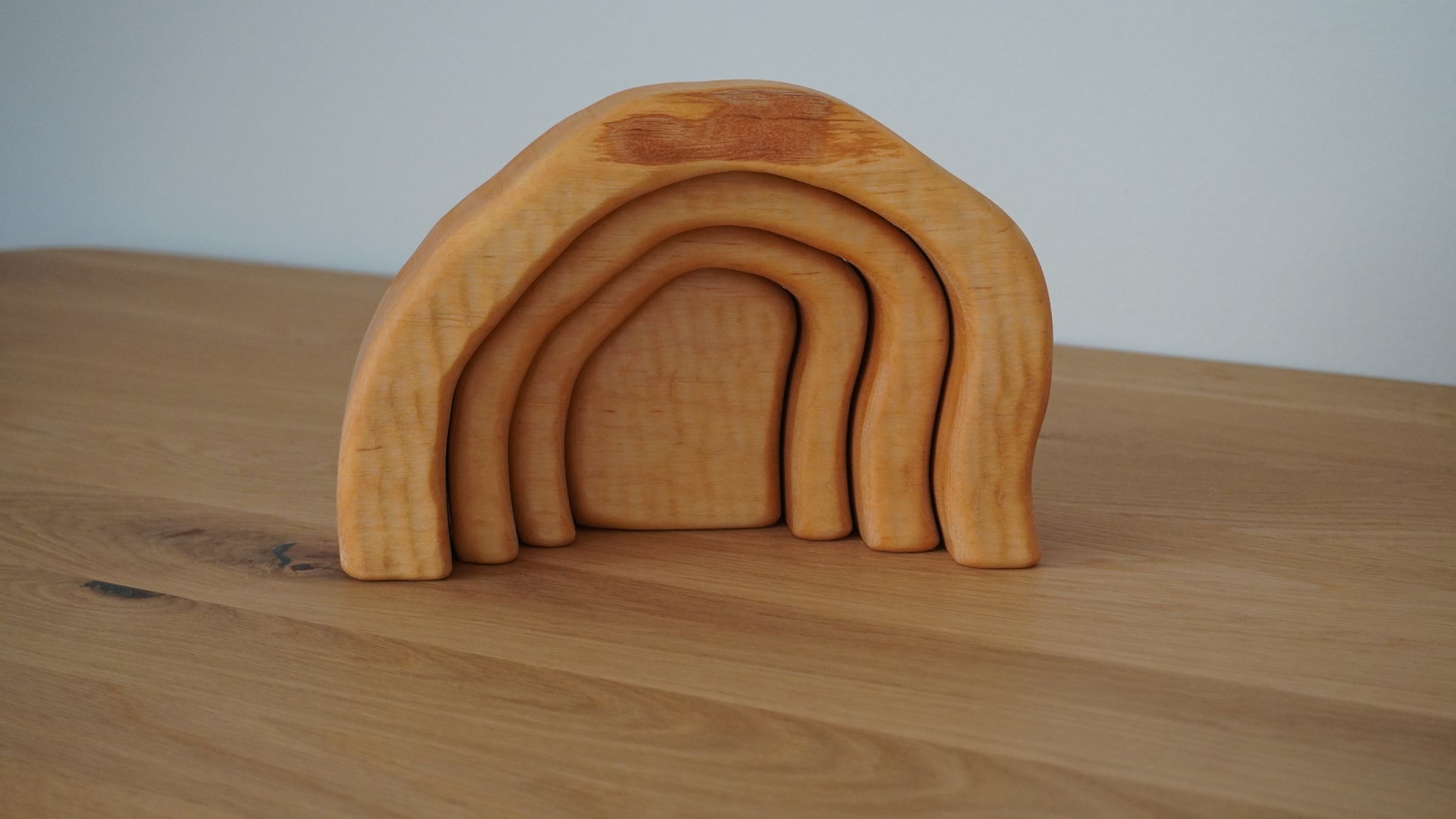 Gefertigt aus regionalem Erlenholz, wird jedes Teil individuell geschnitzt, zugesägt und sorgfältig geschliffen. Alle Kanten sind sanft abgerundet. Einige Elemente behalten ihre natürliche Baumborke, die fest mit dem Holz verbunden ist. Diese Kombination aus glatten und gebürsteten Oberflächen fördert nachhaltig den Tastsinn.