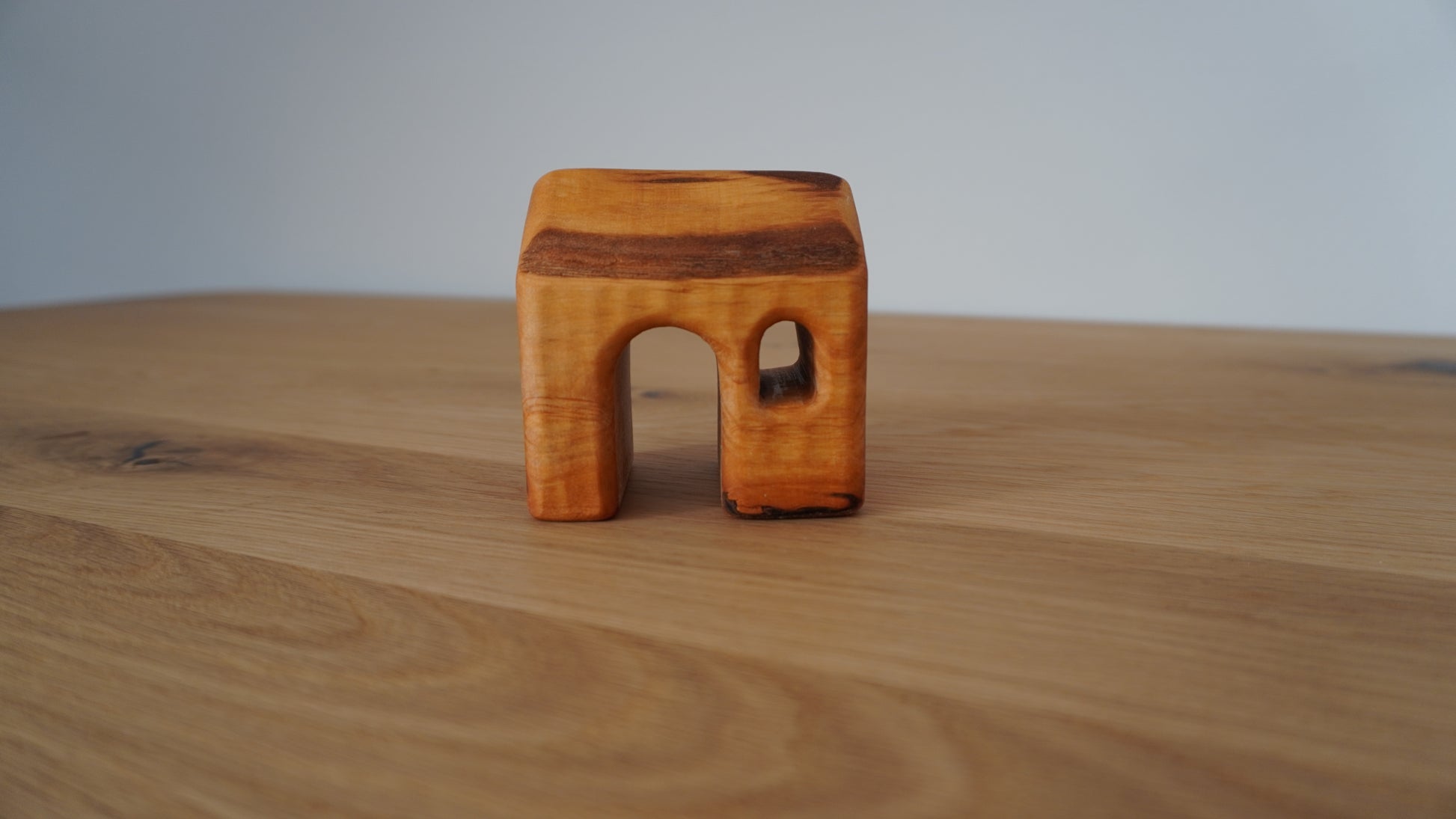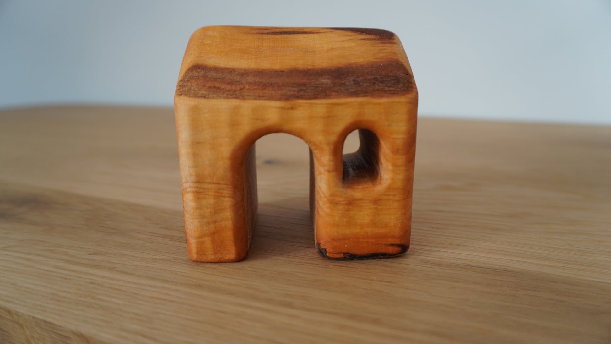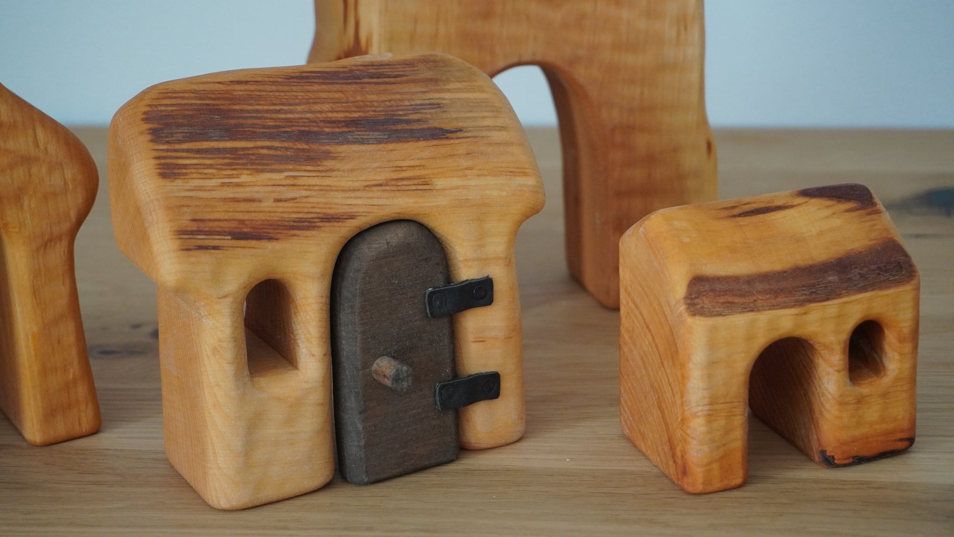 Gefertigt aus regionalem Erlenholz, wird jedes Teil individuell geschnitzt, zugesägt und sorgfältig geschliffen. Alle Kanten sind sanft abgerundet. Einige Elemente behalten ihre natürliche Baumborke, die fest mit dem Holz verbunden ist. Diese Kombination aus glatten und gebürsteten Oberflächen fördert nachhaltig den Tastsinn.