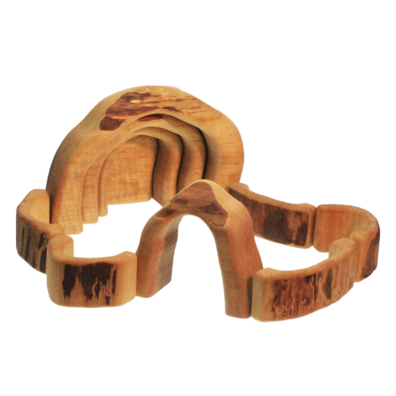 Hergestellt aus regionalem Erlenholz, wird jedes Teil einzeln geschnitzt, zugesägt und sorgfältig geschliffen. Alle Kanten sind abgerundet, sodass das Spielen besonders sicher ist. Einige Teile behalten die natürliche Baumrinde, die fest am Holz sitzt – diese gebürsteten Oberflächen trainieren den Tastsinn und bieten ein einzigartiges haptisches Erlebnis.