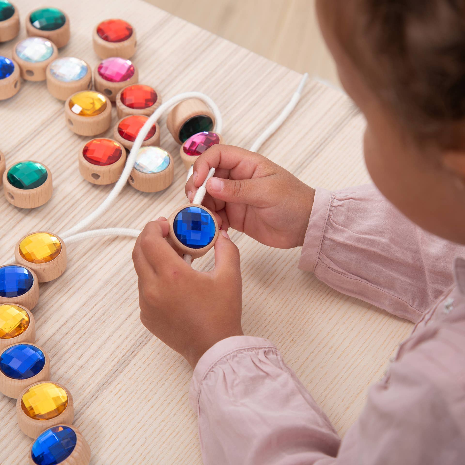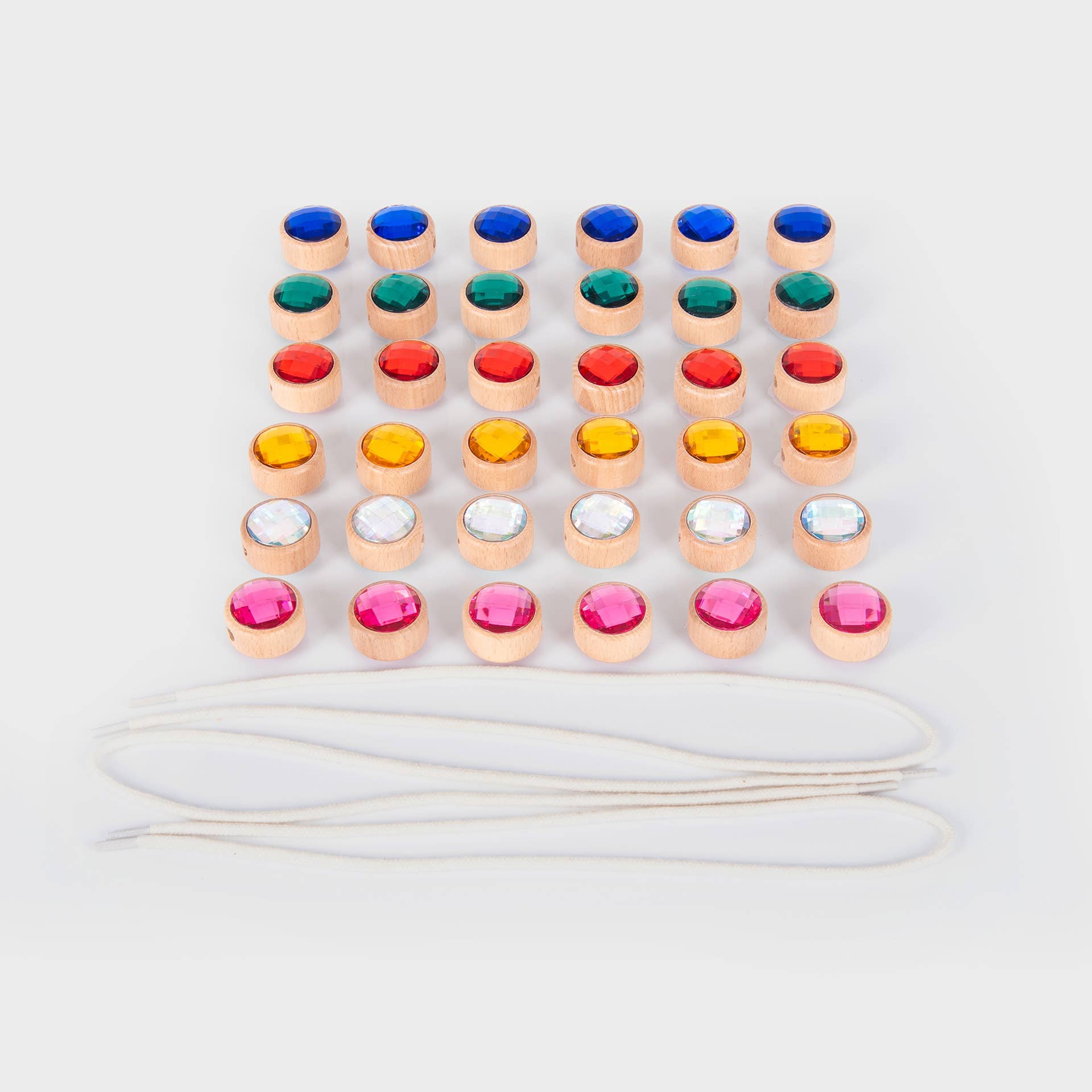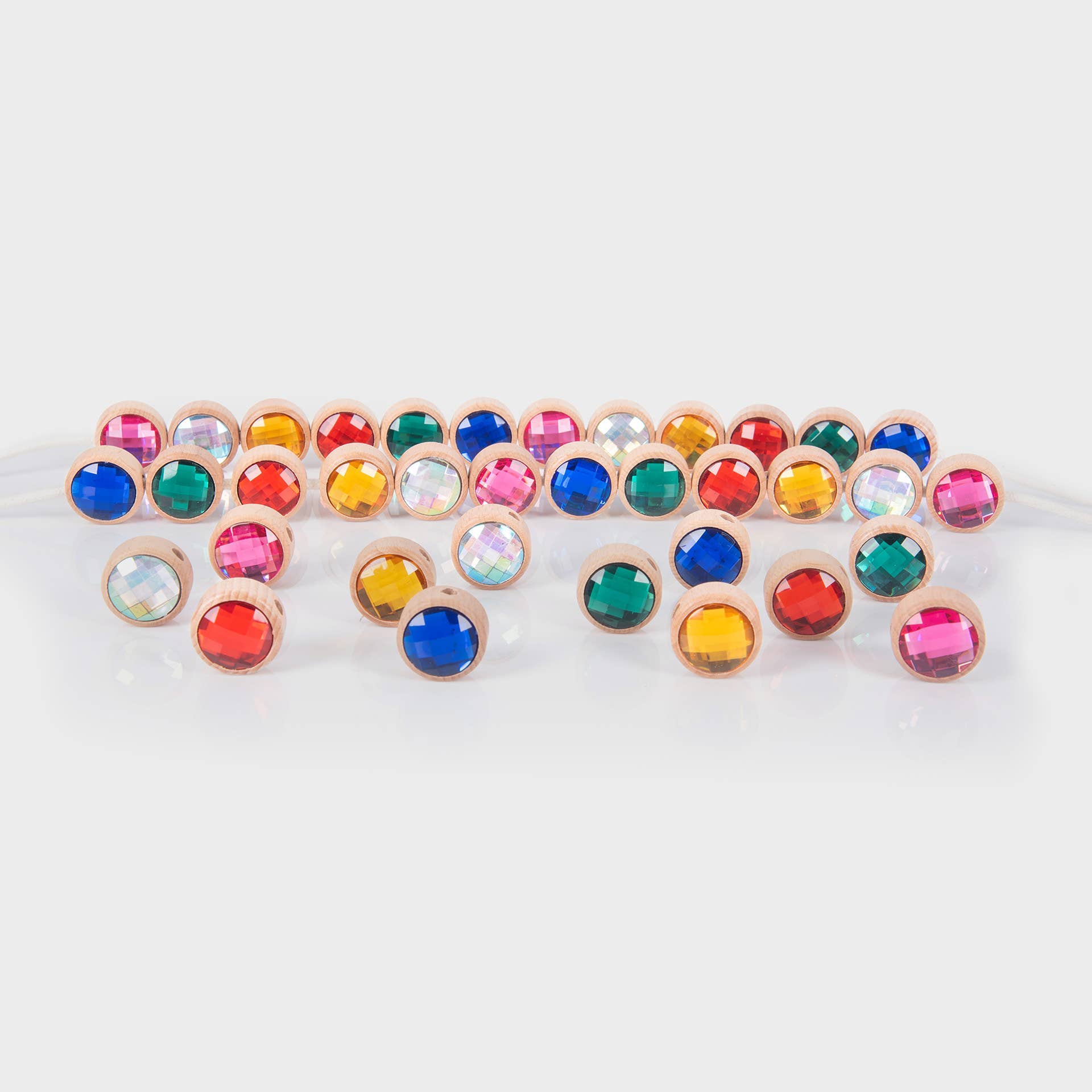 Führen Sie Ihr Kind in eine Welt voller Farben und Kreativität mit diesen leuchtend bunten Acryljuwelen ein, die wunderschön in glatte und klobige FSC®-zertifizierte Buchenholzrahmen eingefasst sind. Jedes Juwel ist doppelseitig mit einem polierten, facettierten Finish, das entworfen wurde, um das Licht einzufangen und lebendige, glänzende Farben zu präsentieren. Ein zentrales Fädelloch in jedem Holzrahmen ermöglicht es, die Juwelen in Mustern oder Sequenzen zusammenzufädeln, was endlose kreative Möglichkeiten fördert.