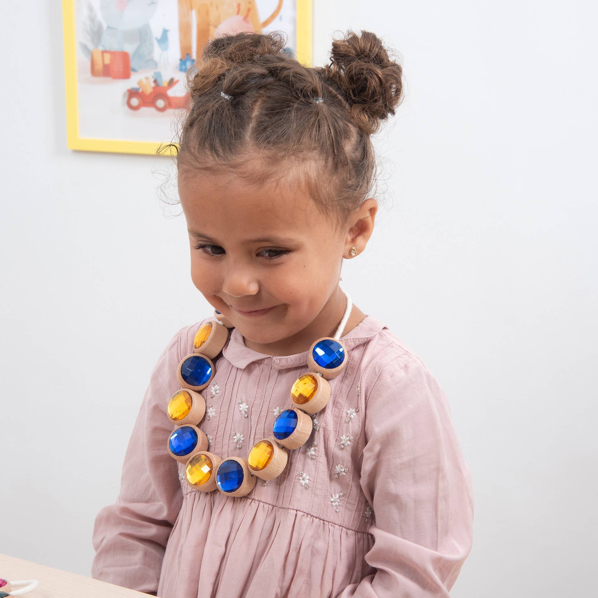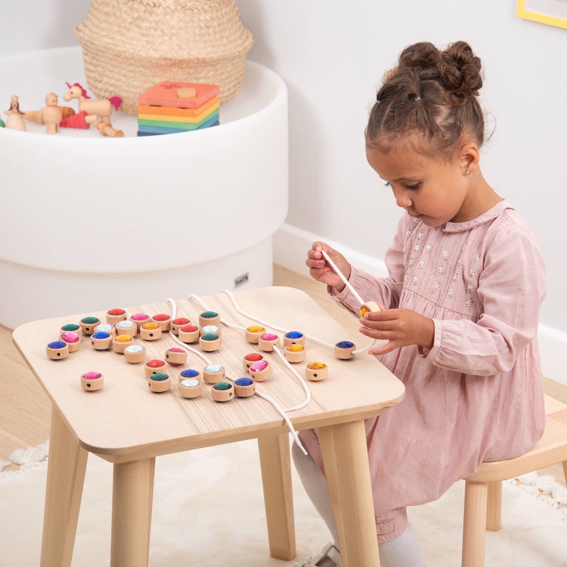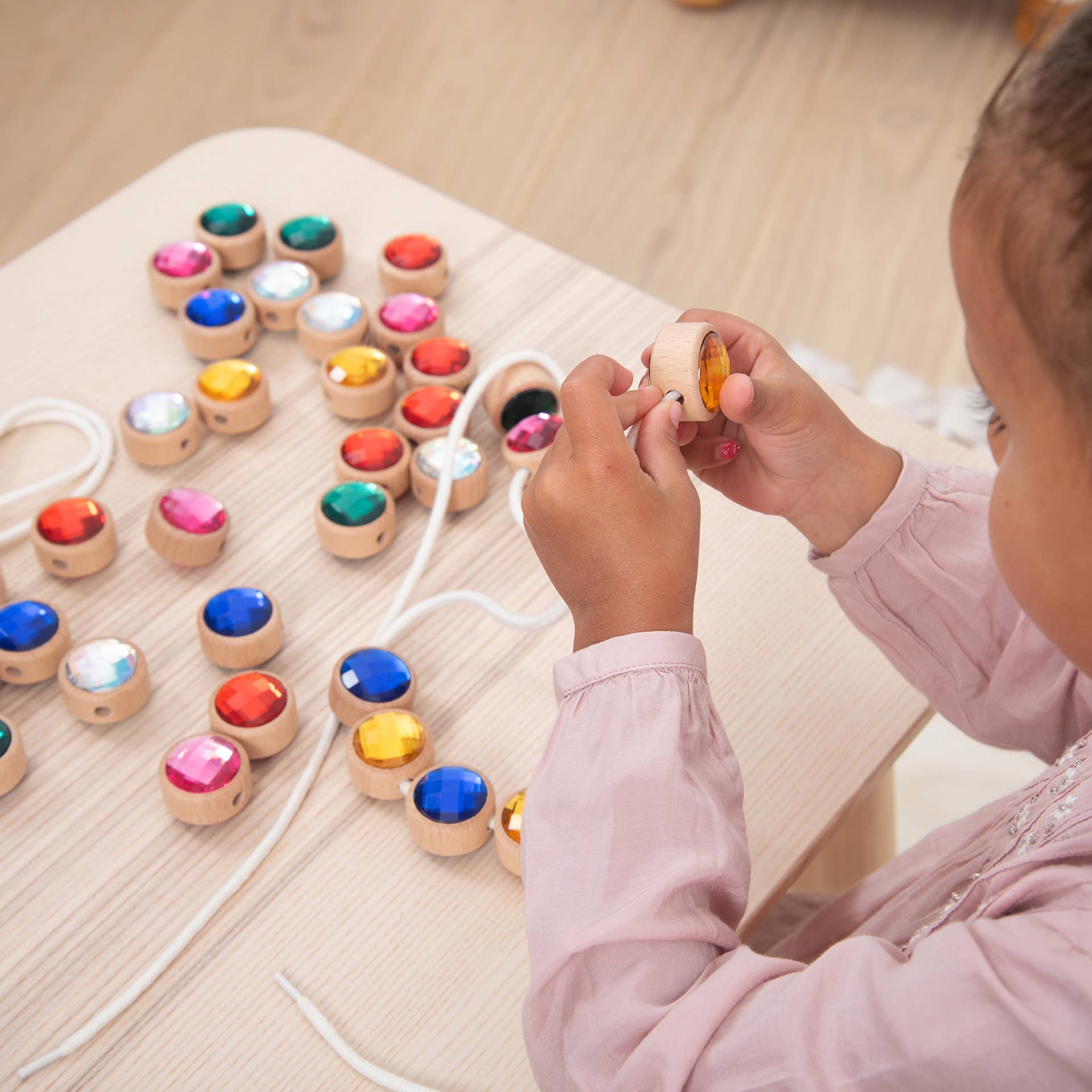 Führen Sie Ihr Kind in eine Welt voller Farben und Kreativität mit diesen leuchtend bunten Acryljuwelen ein, die wunderschön in glatte und klobige FSC®-zertifizierte Buchenholzrahmen eingefasst sind. Jedes Juwel ist doppelseitig mit einem polierten, facettierten Finish, das entworfen wurde, um das Licht einzufangen und lebendige, glänzende Farben zu präsentieren. Ein zentrales Fädelloch in jedem Holzrahmen ermöglicht es, die Juwelen in Mustern oder Sequenzen zusammenzufädeln, was endlose kreative Möglichkeiten fördert.
