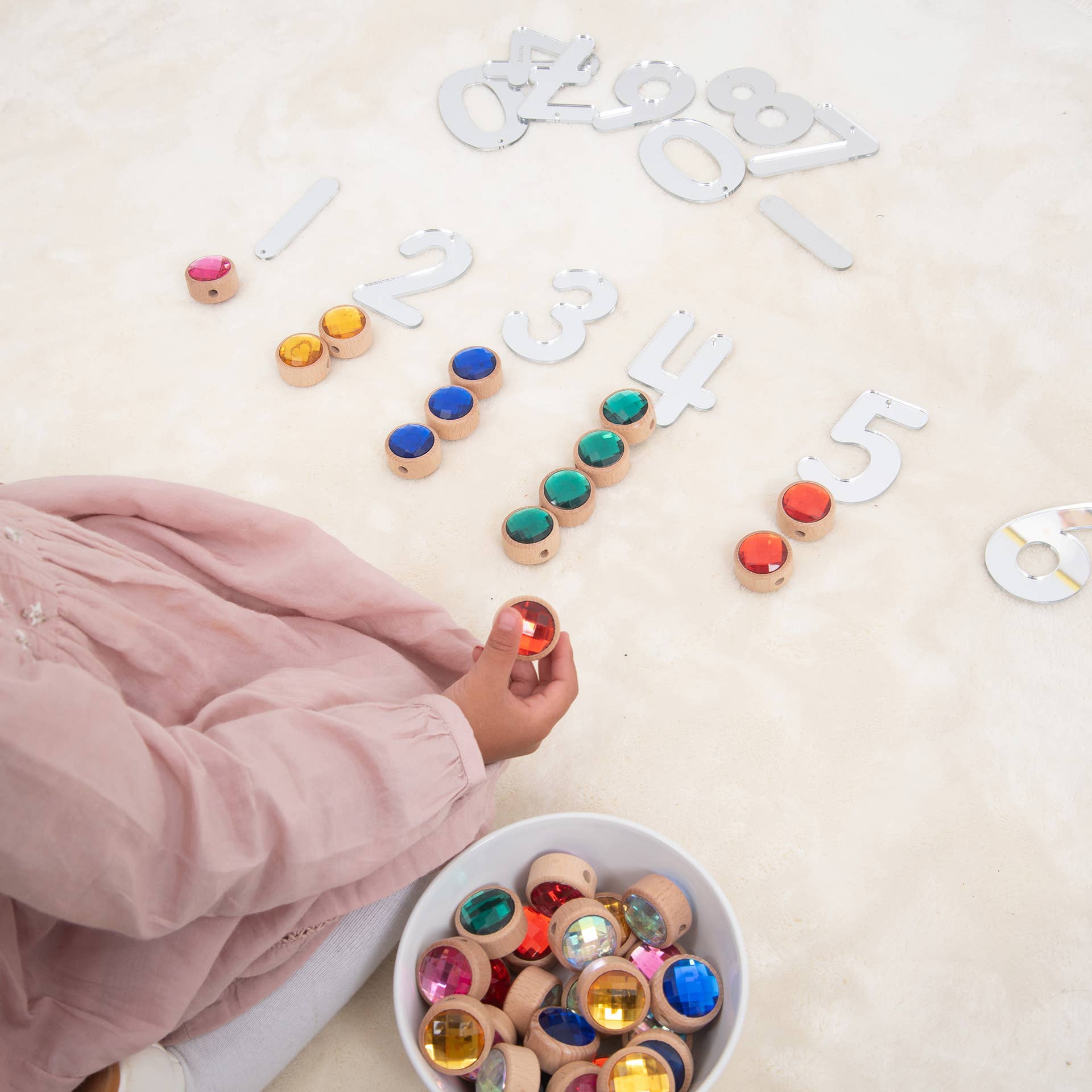Dieses vielseitige Set ist perfekt, um Koordination und Feinmotorik zu entwickeln, Zählen und Sortieren zu üben und fantasievolles Spielen zu fördern. Es ist auch ein wunderbares Werkzeug, um beschreibende Sprache und Geschichtenerzählen zu fördern, während Kinder die funkelnden Juwelen erkunden.